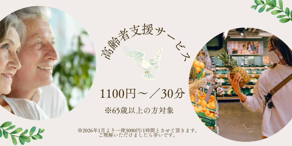 通院の付き添い(カラダやココロで不安なことを必要であれば代弁サポート)、買い物同行、「行きたい所に行く!」のサポート